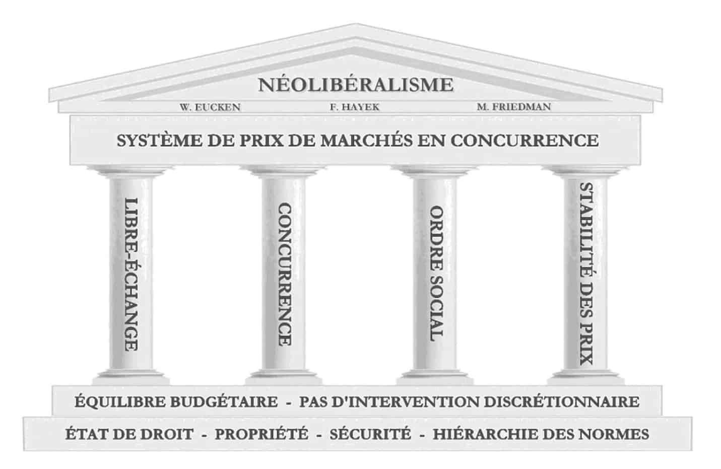 D. Cayla : Dans mon livre, j’ai représenté la doctrine néolibérale par un temple qui permet de rassembler ce qui est commun chez tous les auteurs à l’origine de celle-ci. Ce qui est commun n’est pas forcément visible et nécessite interprétation. Le point commun est tout d’abord une théorie de l’État et de son rôle. Il doit être neutre et éviter les interventions discrétionnaires et de déranger l’économie, et se base ainsi sur l’État de droit. Son objectif est d’instaurer des marchés qui coordonnent les comportements des uns et des autres par les prix, ces prix devant être neutres. Pour que les prix soient pertinents et représentent l’état de la société, il faut garantir quatre piliers : libre-échange, concurrence, stabilité des prix et ordre social.